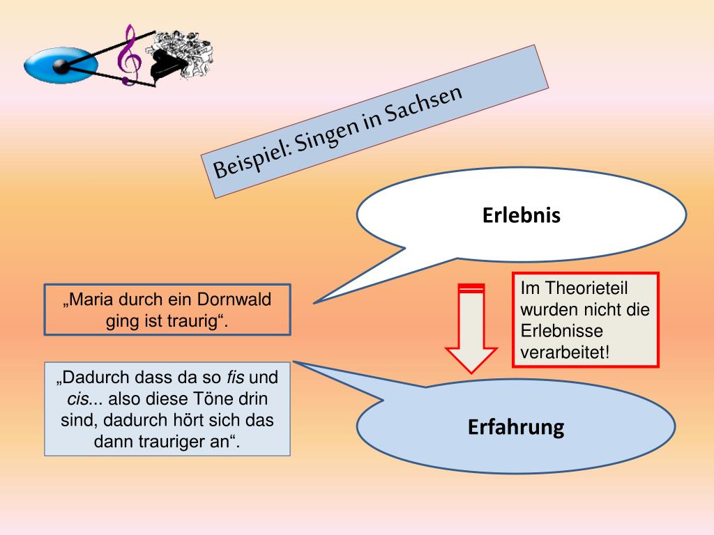 Beispiel: Singen in Sachsen Erlebnis Im Theorieteil wurden nicht die Erlebnisse verarbeitet! „Maria durch ein Dornwald ging ist traurig“. „Dadurch dass da so fis und cis... also diese Töne drin sind, dadurch hört sich das dann trauriger an“. Erfahrung