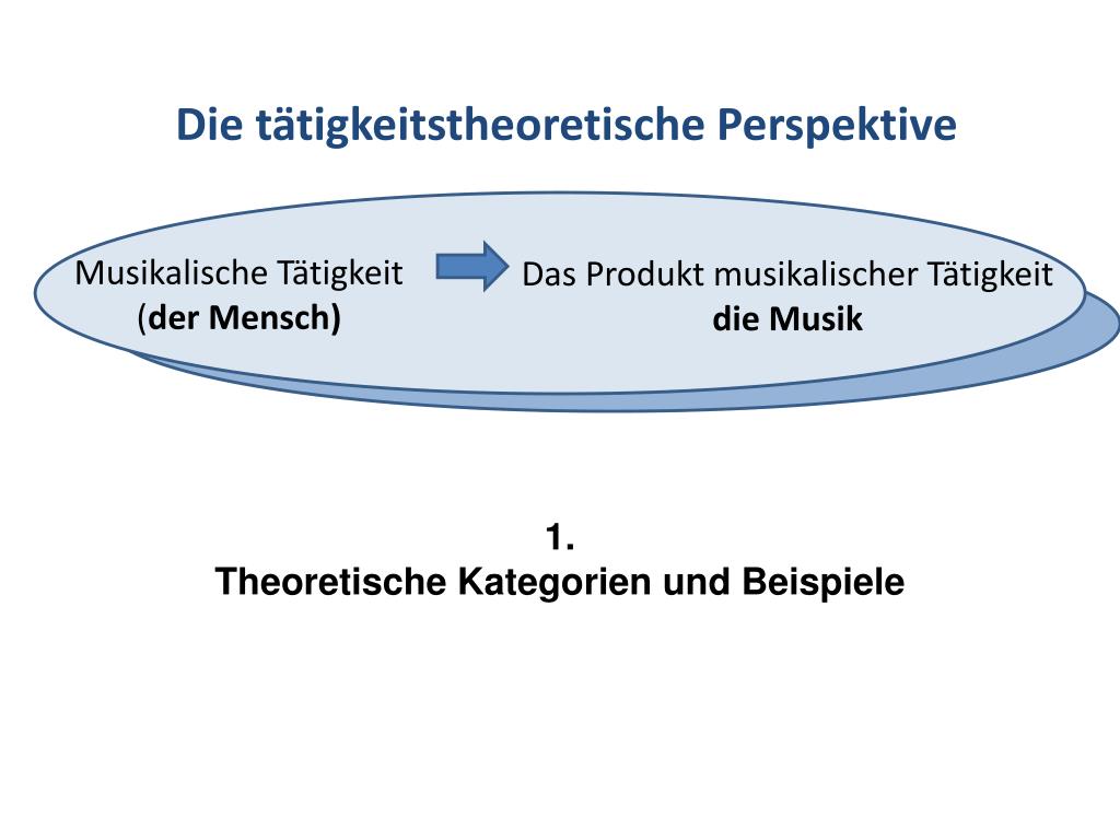 Die tätigkeitstheoretische Perspektive. „Perspektiven der Musikdidaktik“. Die tätigkeitstheoretische Perspektive. 1. Theoretische Kategorien und Beispiele. Die tätigkeitstheoretische Perspektive. Musikalische Tätigkeit ( der Mensch). Das Produkt musikalischer Tätigkeit die Musik. 1.