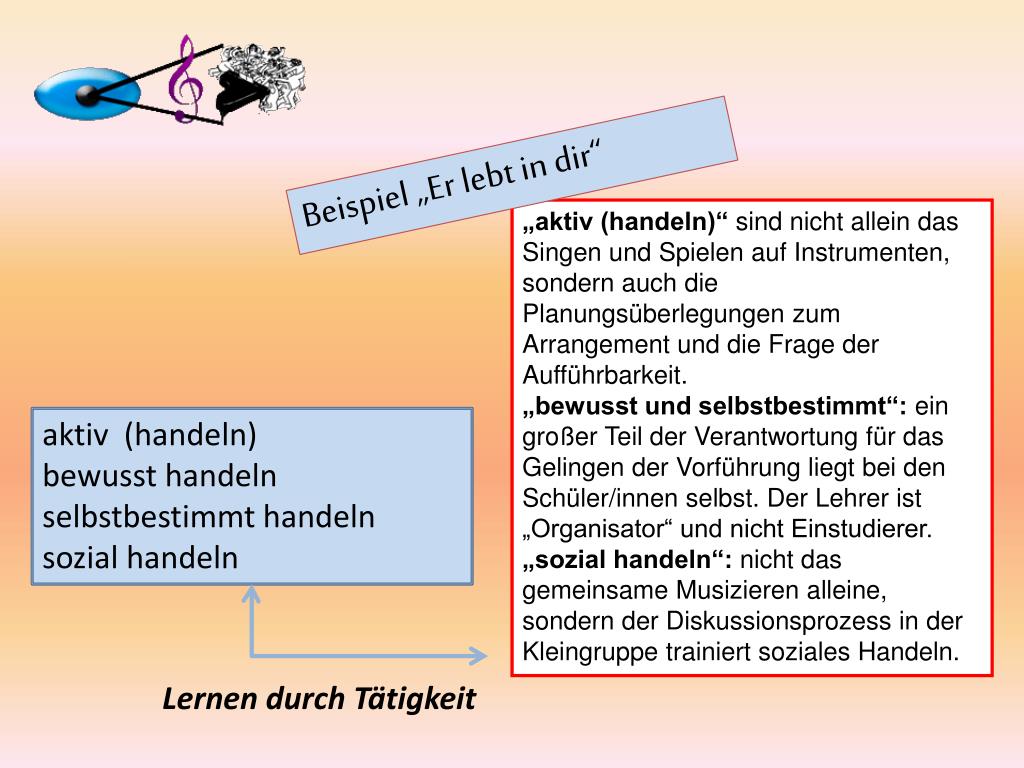 Beispiel „Er lebt in dir“ „aktiv (handeln)“ sind nicht allein das Singen und Spielen auf Instrumenten, sondern auch die Planungsüberlegungen zum Arrangement und die Frage der Aufführbarkeit. „bewusst und selbstbestimmt“: ein großer Teil der Verantwortung für das Gelingen der Vorführung liegt bei den Schüler/innen selbst. Der Lehrer ist „Organisator“ und nicht Einstudierer. „sozial handeln“: nicht das gemeinsame Musizieren alleine, sondern der Diskussionsprozess in der Kleingruppe trainiert soziales Handeln. aktiv (handeln) bewusst handeln selbstbestimmt handeln sozial handeln Lernen durch Tätigkeit