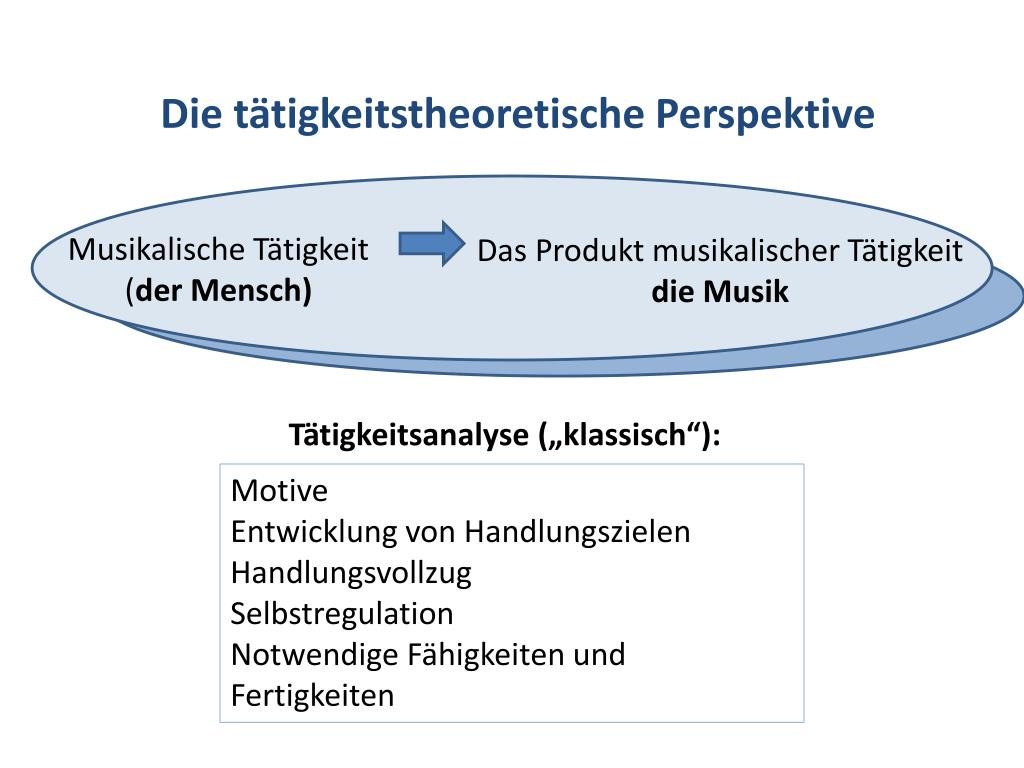Die tätigkeitstheoretische Perspektive Musikalische Tätigkeit (der Mensch) Das Produkt musikalischer Tätigkeit die Musik Tätigkeitsanalyse („klassisch“): Motive Entwicklung von Handlungszielen Handlungsvollzug Selbstregulation Notwendige Fähigkeiten und Fertigkeiten