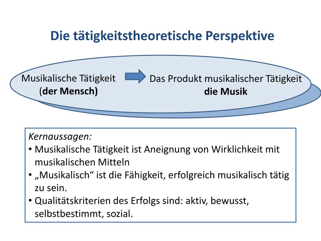 Die tätigkeitstheoretische Perspektive Musikalische Tätigkeit (der Mensch) Das Produkt musikalischer Tätigkeit die Musik • Kernaussagen: • Musikalische Tätigkeit ist Aneignung von Wirklichkeit mit musikalischen Mitteln • „Musikalisch“ ist die Fähigkeit, erfolgreich musikalisch tätig zu sein. • Qualitätskriterien des Erfolgs sind: aktiv, bewusst, selbstbestimmt, sozial.