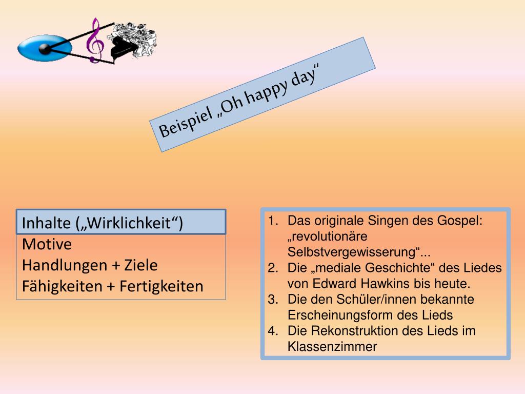 Beispiel „Oh happy day“ Inhalte („Wirklichkeit“) Motive Handlungen + Ziele Fähigkeiten + Fertigkeiten • Das originale Singen des Gospel: „revolutionäre Selbstvergewisserung“... • Die „mediale Geschichte“ des Liedes von Edward Hawkins bis heute. • Die den Schüler/innen bekannte Erscheinungsform des Lieds • Die Rekonstruktion des Lieds im Klassenzimmer