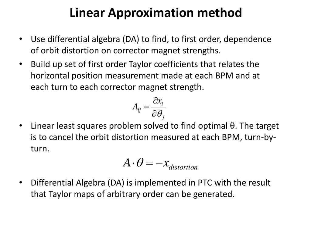 Linear Approximation method • Use differential algebra (DA) to find, to first order, dependence of orbit distortion on corrector magnet strengths. • Build up set of first order Taylor coefficients that relates the horizontal position measurement made at each BPM and at each turn to each corrector magnet strength. • Linear least squares problem solved to find optimal . The target is to cancel the orbit distortion measured at each BPM, turn-by-turn. • Differential Algebra (DA) is implemented in PTC with the result that Taylor maps of arbitrary order can be generated.