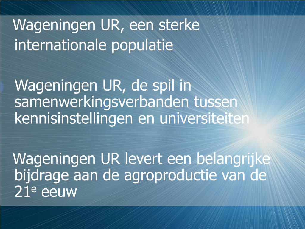 Wageningen UR, een sterke internationale populatie Wageningen UR, de spil in samenwerkingsverbanden tussen kennisinstellingen en universiteiten Wageningen UR levert een belangrijke bijdrage aan de agroproductie van de 21e eeuw