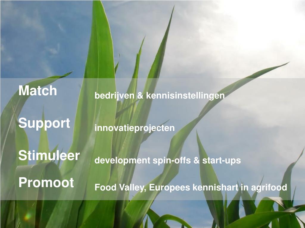 Match bedrijven & kennisinstellingen • Support innovatieprojecten • Stimuleer development spin-offs & start-ups • Promoot Food Valley, Europees kennishart in agrifood