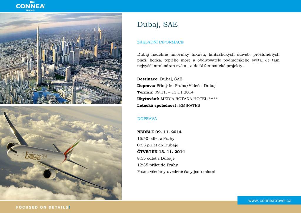 Dubaj, SAE Základní informace • Dubaj nadchne milovníky luxusu, fantastických staveb, prosluněných pláží, horka, teplého moře a obdivovatele podmořského světa. Je tam nejvyšší mrakodrap světa - a další fantastické projekty. • Destinace: Dubaj, SAE • Doprava: Přímý let Praha/Vídeň - Dubaj • Termín: 09.11. – 13.11.2014 • Ubytování: MEDIA ROTANA HOTEL ***** • Letecká společnost: EMIRATES • Doprava • NEDĚLE 09. 11. 2014 • 15:50 odlet z Prahy • 0:55 přílet do Dubaje • ČTVRTEK 13. 11. 2014 • 8:55 odlet z Dubaje • 12:35 přílet do Prahy • Pozn.: všechny uvedené časy jsou místní.