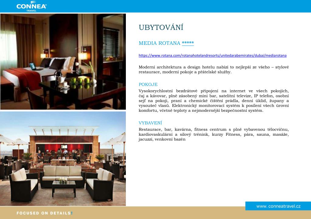 ubytování • media rotana***** • https://www.rotana.com/rotanahotelandresorts/unitedarabemirates/dubai/mediarotana • Moderní architektura a design hotelu nabízí to nejlepší ze všeho – stylové restaurace, moderní pokoje a přátelské služby. • POKOJE • Vysokorychlostní bezdrátové připojení na internet ve všech pokojích, čaj a kávovar, plně zásobený mini bar, satelitní televize, IP telefon, osobní sejf na pokoji, praní a chemické čištění prádla, denní úklid, župany a vysoušeč vlasů. Elektronický monitorovací systém k posílení všech úrovní komfortu, včetně teploty a nejmodernější bezpečnostní systém. • VYBAVENÍ • Restaurace, bar, kavárna, fitness centrum s plně vybavenou tělocvičnu, kardiovaskulární a silový trénink, kurzy Fitness, pára, sauna, masáže, jacuzzi, venkovní bazén