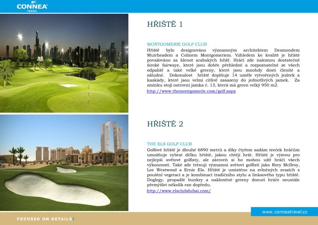 HřIště 1 • montgomerie golf club • Hřiště bylo designováno významným architektem Desmondem Muirheadem a ColinemMontgomeriem. Vzhledem ke kvalitě je hřiště považováno za klenot arabských hřišť. Hráči zde naleznou dostatečně široké fairwaye, které jsou dobře přehledné a rozpoznatelné ze všech odpališť a také velké greeny, které jsou mnohdy dosti členité a záludné. Dokonalost hřiště doplňuje 14 uměle vytvořených jezírek a kaskády, které jsou velmi citlivě zasazeny do jednotlivých jamek. Za zmínku stojí ostrovní jamka č. 13, která má green velký 950 m2. • http://www.themontgomerie.com/golf.aspx • HřIště 2 • THEELSGOLfCLUb • Golfové hřiště je dlouhé 6890 metrů a díky čtyřem sadám teeček hráčům umožňuje vybrat délku hřiště, jakou chtějí hrát. Hřiště je výzvou pro nejlepší světové golfisty, ale zároveň si ho mohou užít hráči všech výkonností. Také zde trénují významní světoví golfisti jako RoryMcIlroy, LeeWestwood a ErnieEls. Hřiště je umístěno na zvlněných svazích s pouštní vegetací a je kombinací tradičního stylu a linksového typu hřiště. Doglegy, propadlé bunkry a nakloněné greeny donutí hráče neustále přemýšlet několik ran dopředu. • http://www.elsclubdubai.com/