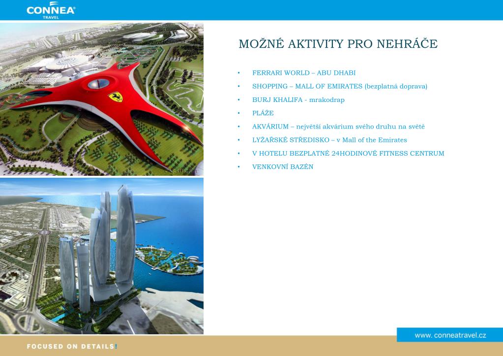 Možné aktivity pro nehráče • FERRARI WORLD – ABU DHABI • SHOPPING – MALL OF EMIRATES (bezplatná doprava) • BURJ KHALIFA - mrakodrap • PLÁŽE • AKVÁRIUM – největší akvárium svého druhu na světě • LYŽAŘSKÉ STŘEDISKO – v MalloftheEmirates • V HOTELU BEZPLATNÉ 24HODINOVÉ FITNESS CENTRUM • VENKOVNÍ BAZÉN