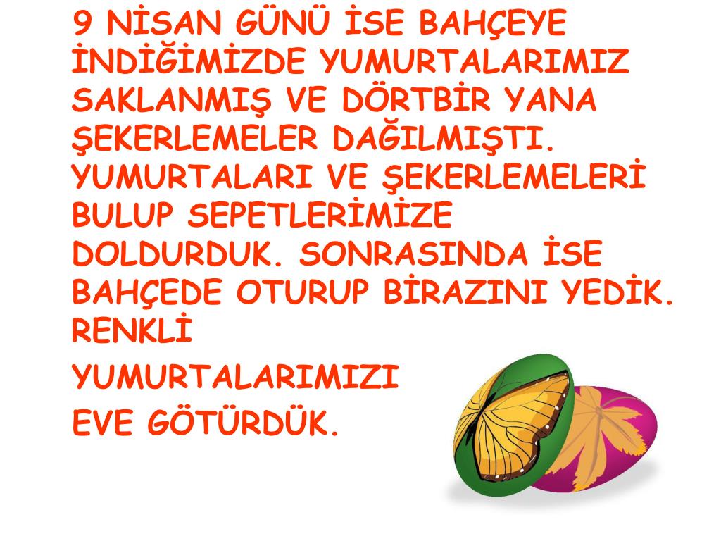 9 NİSAN GÜNÜ İSE BAHÇEYE İNDİĞİMİZDE YUMURTALARIMIZ SAKLANMIŞ VE DÖRTBİR YANA ŞEKERLEMELER DAĞILMIŞTI. YUMURTALARI VE ŞEKERLEMELERİ BULUP SEPETLERİMİZE DOLDURDUK. SONRASINDA İSE BAHÇEDE OTURUP BİRAZINI YEDİK. RENKLİ YUMURTALARIMIZI EVE GÖTÜRDÜK.