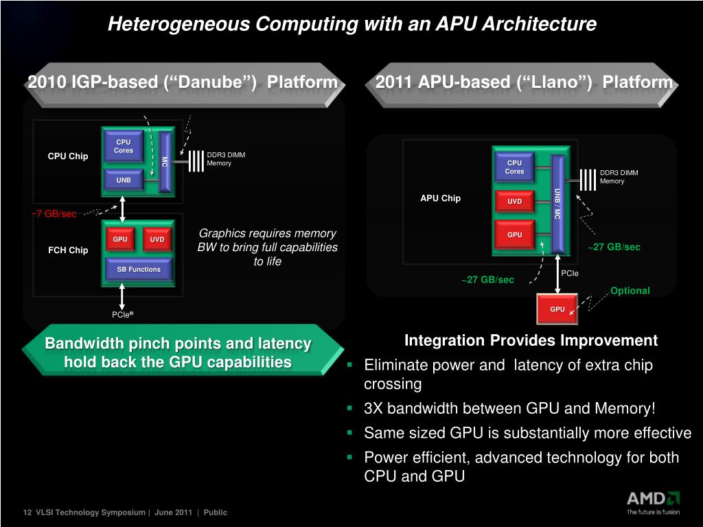 The Challenges of Integration GPU CPU Performance Density Thick, fast metal Big devices Dense, thin metal, small devices Flop count for Llano GPU =3.5M Flop count for 4 Llano CPU cores=0.66M CPU flop area = 2.14 GPU flop area = 1.0