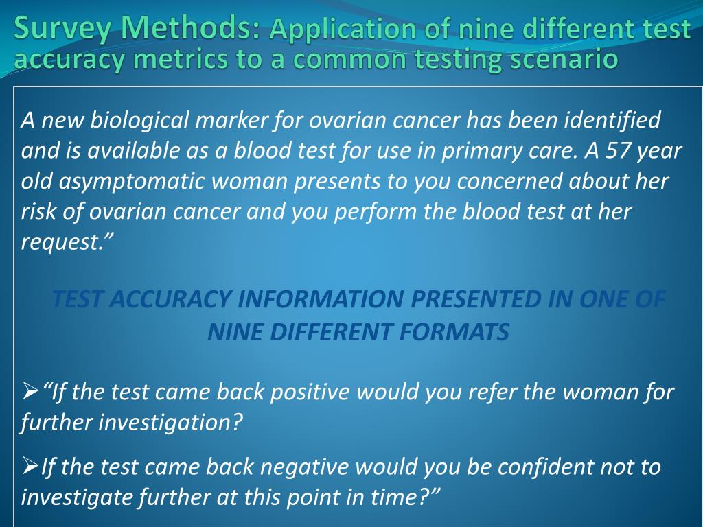 A new biological marker for ovarian cancer has been identified and is available as a blood test for use in primary care. A 57 year old asymptomatic woman presents to you concerned about her risk of ovarian cancer and you perform the blood test at her request.” • TEST ACCURACY INFORMATION PRESENTED IN ONE OF NINE DIFFERENT FORMATS • “If the test came back positive would you refer the woman for further investigation? • If the test came back negative would you be confident not to investigate further at this point in time?” Survey Methods: Application of nine different test accuracy metrics to a common testing scenario