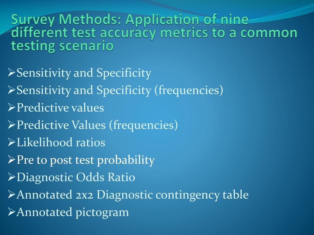 Survey Methods: Application of nine different test accuracy metrics to a common testing scenario • Sensitivity and Specificity • Sensitivity and Specificity (frequencies) • Predictive values • Predictive Values (frequencies) • Likelihood ratios • Pre to post test probability • Diagnostic Odds Ratio • Annotated 2x2 Diagnostic contingency table • Annotated pictogram
