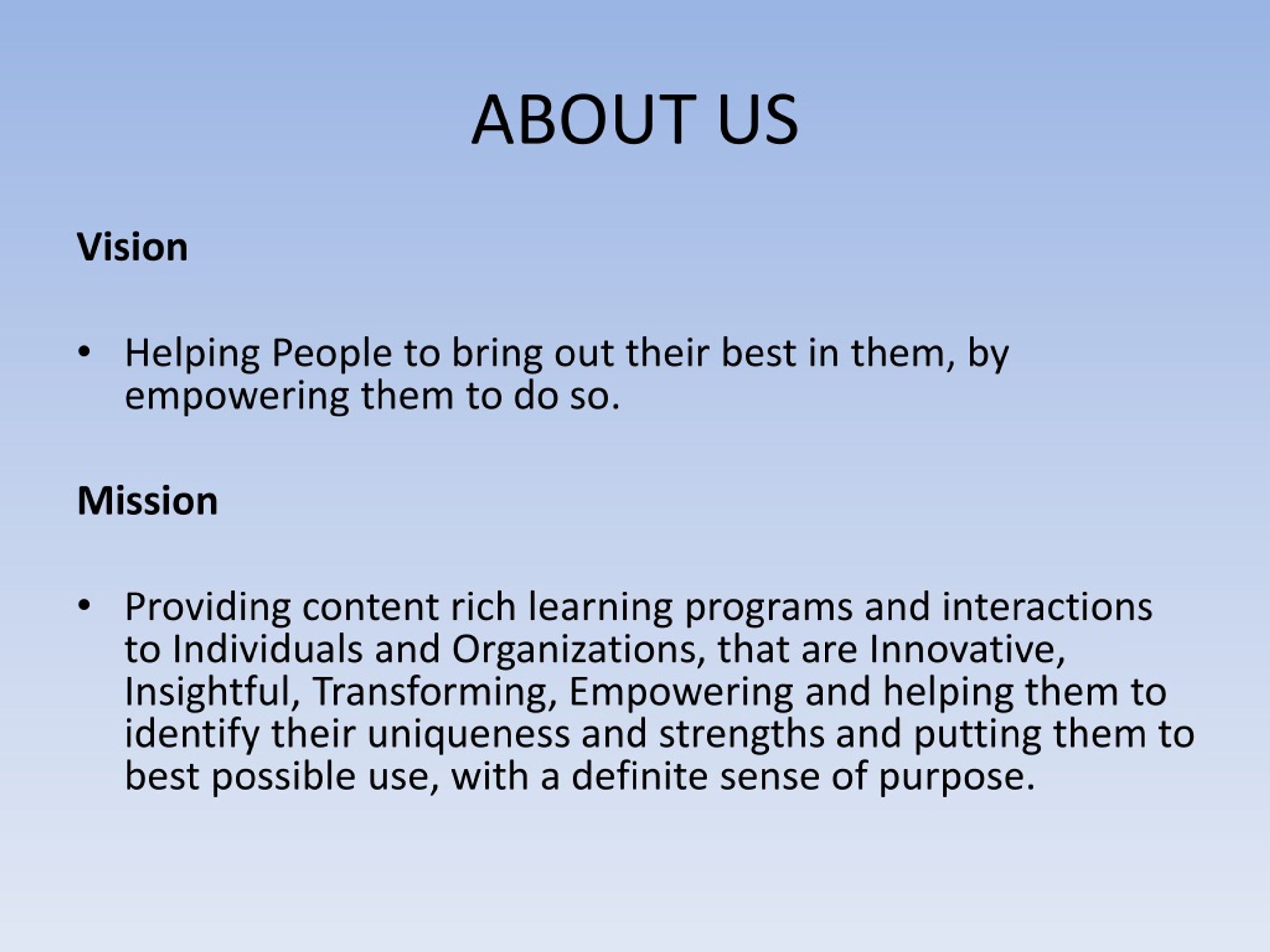 ABOUT US Vision • Helping People to bring out their best in them, by empowering them to do so. Mission • Providing content rich learning programs and interactions to Individuals and Organizations, that are Innovative, Insightful, Transforming, Empowering and helping them to identify their uniqueness and strengths and putting them to best possible use, with a definite sense of purpose.