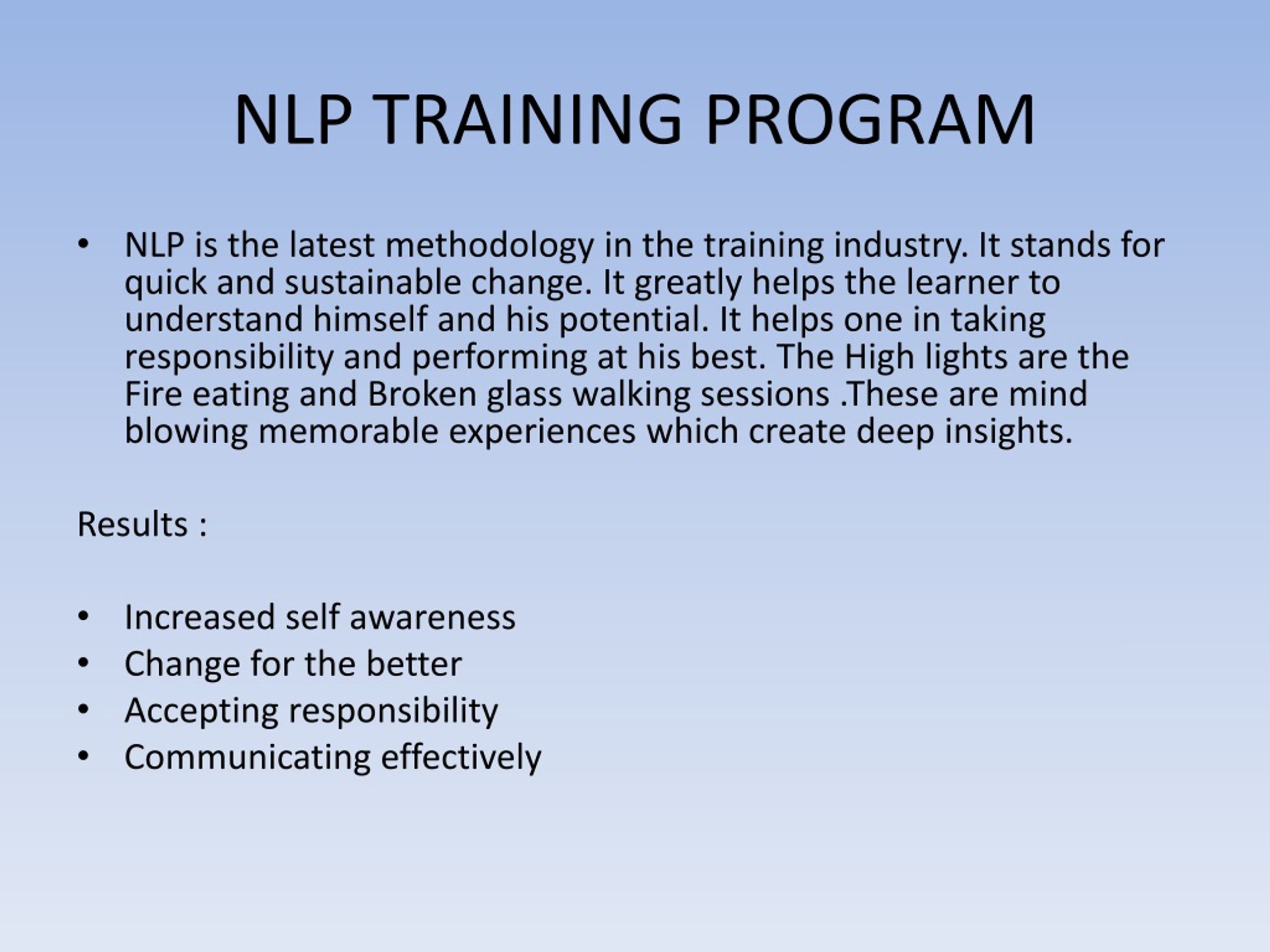 NLP TRAINING PROGRAM • NLP is the latest methodology in the training industry. It stands for quick and sustainable change. It greatly helps the learner to understand himself and his potential. It helps one in taking responsibility and performing at his best. The High lights are the Fire eating and Broken glass walking sessions .These are mind blowing memorable experiences which create deep insights. Results : • Increased self awareness • Change for the better • Accepting responsibility • Communicating effectively