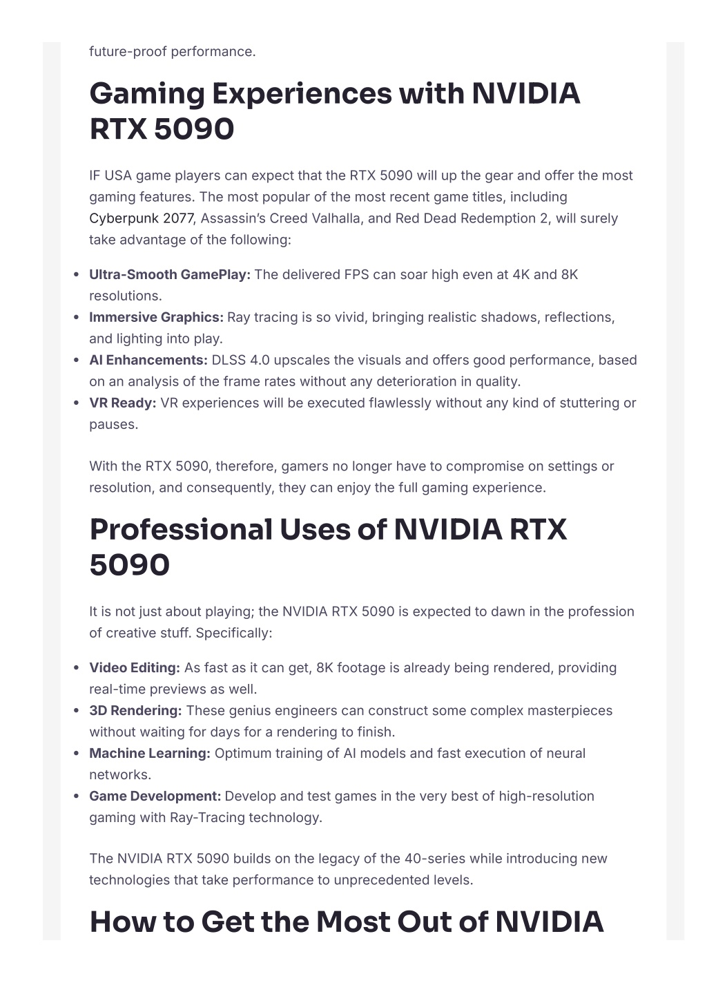 future-proofperformance. Gaming Experiences with NVIDIA RTX 5090 IFUSAgameplayerscanexpectthattheRTX 5090 willupthegearandofferthemost gamingfeatures. Themostpopularofthemostrecentgametitles, including Cyberpunk 2077, AssassinʼsCreedValhalla, andRedDeadRedemption 2, willsurely takeadvantageofthefollowing: Ultra-SmoothGamePlay: ThedeliveredFPScansoarhighevenat 4Kand 8K resolutions. ImmersiveGraphics: Raytracingissovivid, bringingrealisticshadows, reflections, andlightingintoplay. AIEnhancements:DLSS 4.0 upscalesthevisualsandoffersgoodperformance, based onananalysisoftheframerateswithoutanydeteriorationinquality. VRReady:VRexperienceswillbeexecutedflawlesslywithoutanykindofstutteringor pauses. WiththeRTX 5090, therefore, gamersnolongerhavetocompromiseonsettingsor resolution, andconsequently, theycanenjoythefullgamingexperience. Professional Uses of NVIDIA RTX 5090 Itisnotjustaboutplaying; theNVIDIARTX 5090 isexpectedtodawnintheprofession ofcreativestuff. Specifically: VideoEditing:Asfastasitcanget, 8Kfootageisalreadybeingrendered, providing real-timepreviewsaswell. 3DRendering:Thesegeniusengineerscanconstructsomecomplexmasterpieces withoutwaitingfordaysforarenderingtofinish. MachineLearning:OptimumtrainingofAImodelsandfastexecutionofneural networks. GameDevelopment: Developandtestgamesintheverybestofhigh-resolution gamingwithRay-Tracingtechnology. TheNVIDIARTX 5090 buildsonthelegacyofthe 40-serieswhileintroducingnew technologiesthattakeperformancetounprecedentedlevels. How to Get the Most Out of NVIDIA