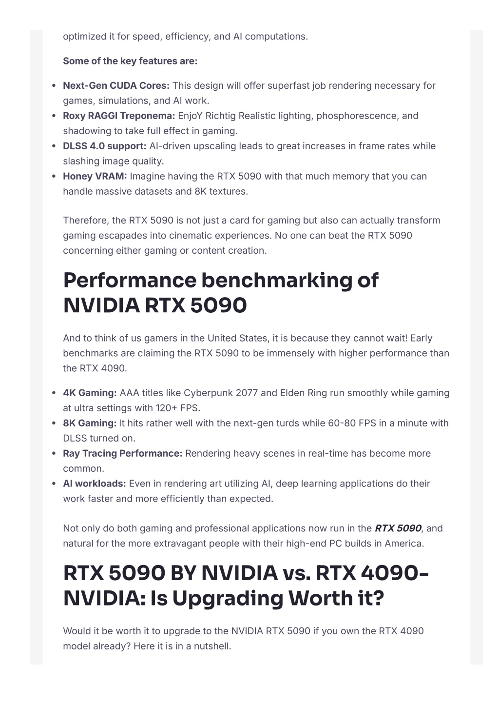 optimizeditforspeed, efficiency, andAIcomputations. Someofthekeyfeaturesare: Next-GenCUDACores:Thisdesignwilloffersuperfastjobrenderingnecessaryfor games, simulations, andAIwork. RoxyRAGGITreponema:EnjoYRichtigRealisticlighting, phosphorescence, and shadowingtotakefulleffectingaming. DLSS 4.0 support:AI-drivenupscalingleadstogreatincreasesinframerateswhile slashingimagequality. HoneyVRAM?ImaginehavingtheRTX 5090 withthatmuchmemorythatyoucan handlemassivedatasetsand 8Ktextures. Therefore, theRTX 5090 isnotjustacardforgamingbutalsocanactuallytransform gamingescapadesintocinematicexperiences. NoonecanbeattheRTX 5090 concerningeithergamingorcontentcreation. Performance benchmarking of NVIDIA RTX 5090 AndtothinkofusgamersintheUnitedStates, itisbecausetheycannotwait! Early benchmarksareclaimingtheRTX 5090 tobeimmenselywithhigherperformancethan theRTX 4090. 4KGaming:AAAtitleslikeCyberpunk 2077 andEldenRingrunsmoothlywhilegaming atultrasettingswith 120? FPS. 8KGaming: Ithitsratherwellwiththenext-genturdswhile 60?80 FPSinaminutewith DLSSturnedon. RayTracingPerformance:Renderingheavyscenesinreal-timehasbecomemore common. AIworkloads:EveninrenderingartutilizingAI, deeplearningapplicationsdotheir workfasterandmoreefficientlythanexpected. NotonlydobothgamingandprofessionalapplicationsnowrunintheRTX 5090, and naturalforthemoreextravagantpeoplewiththeirhigh-endPCbuildsinAmerica. RTX 5090 BY NVIDIA vs. RTX 4090- NVIDIA: Is Upgrading Worth it? WoulditbeworthittoupgradetotheNVIDIARTX 5090 ifyouowntheRTX 4090 modelalready? Hereitisinanutshell.