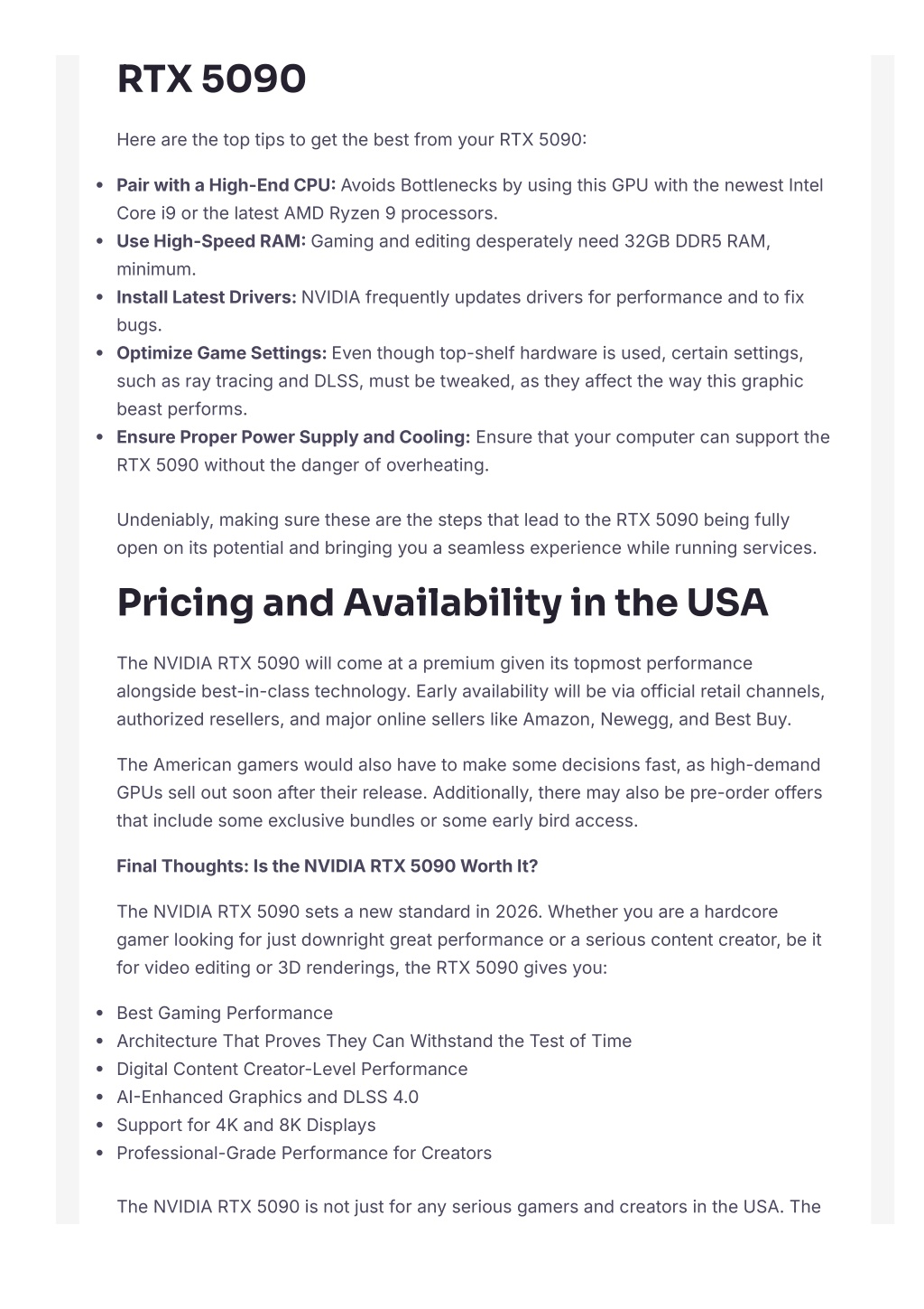 RTX 5090 HerearethetoptipstogetthebestfromyourRTX 5090? PairwithaHigh-EndCPU? AvoidsBottlenecksbyusingthisGPUwiththenewestIntel Corei9 orthelatestAMDRyzen 9 processors. UseHigh-SpeedRAM? Gamingandeditingdesperatelyneed 32GBDDR5 RAM, minimum. InstallLatestDrivers: NVIDIAfrequentlyupdatesdriversforperformanceandtofix bugs. OptimizeGameSettings: Eventhoughtop-shelfhardwareisused, certainsettings, suchasraytracingandDLSS, mustbetweaked, astheyaffectthewaythisgraphic beastperforms. EnsureProperPowerSupplyandCooling:Ensurethatyourcomputercansupportthe RTX 5090 withoutthedangerofoverheating. Undeniably, makingsurethesearethestepsthatleadtotheRTX 5090 beingfully openonitspotentialandbringingyouaseamlessexperiencewhilerunningservices. Pricing and Availability in the USA TheNVIDIARTX 5090 willcomeatapremiumgivenitstopmostperformance alongsidebest-in-classtechnology. Earlyavailabilitywillbeviaofficialretailchannels, authorizedresellers, andmajoronlinesellerslikeAmazon, Newegg, andBestBuy. TheAmericangamerswouldalsohavetomakesomedecisionsfast, ashigh-demand GPUsselloutsoonaftertheirrelease. Additionally, theremayalsobepre-orderoffers thatincludesomeexclusivebundlesorsomeearlybirdaccess. FinalThoughts: IstheNVIDIARTX 5090 WorthIt? TheNVIDIARTX 5090 setsanewstandardin 2026. Whetheryouareahardcore gamerlookingforjustdownrightgreatperformanceoraseriouscontentcreator, beit forvideoeditingor 3Drenderings, theRTX 5090 givesyou: BestGamingPerformance ArchitectureThatProvesTheyCanWithstandtheTestofTime DigitalContentCreator-LevelPerformance AI?EnhancedGraphicsandDLSS 4.0 Supportfor 4Kand 8KDisplays Professional-GradePerformanceforCreators TheNVIDIARTX 5090 isnotjustforanyseriousgamersandcreatorsintheUSA. The