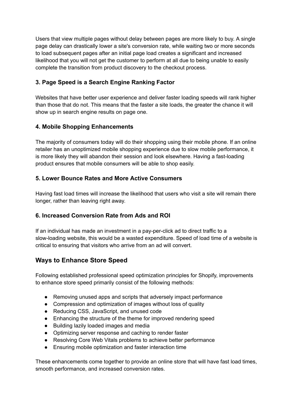 Users that view multiple pages without delay between pages are more likely to buy. A single page delay can drastically lower a site's conversion rate, while waiting two or more seconds to load subsequent pages after an initial page load creates a significant and increased likelihood that you will not get the customer to perform at all due to being unable to easily complete the transition from product discovery to the checkout process. 3. Page Speed is a Search Engine Ranking Factor Websites that have better user experience and deliver faster loading speeds will rank higher than those that do not. This means that the faster a site loads, the greater the chance it will show up in search engine results on page one. 4. Mobile Shopping Enhancements The majority of consumers today will do their shopping using their mobile phone. If an online retailer has an unoptimized mobile shopping experience due to slow mobile performance, it is more likely they will abandon their session and look elsewhere. Having a fast-loading product ensures that mobile consumers will be able to shop easily. 5. Lower Bounce Rates and More Active Consumers Having fast load times will increase the likelihood that users who visit a site will remain there longer, rather than leaving right away. 6. Increased Conversion Rate from Ads and ROI If an individual has made an investment in a pay-per-click ad to direct traffic to a slow-loading website, this would be a wasted expenditure. Speed of load time of a website is critical to ensuring that visitors who arrive from an ad will convert. Ways to Enhance Store Speed Following established professional speed optimization principles for Shopify, improvements to enhance store speed primarily consist of the following methods: ● Removing unused apps and scripts that adversely impact performance ● Compression and optimization of images without loss of quality ● Reducing CSS, JavaScript, and unused code ● Enhancing the structure of the theme for improved rendering speed ● Building lazily loaded images and media ● Optimizing server response and caching to render faster ● Resolving Core Web Vitals problems to achieve better performance ● Ensuring mobile optimization and faster interaction time These enhancements come together to provide an online store that will have fast load times, smooth performance, and increased conversion rates.