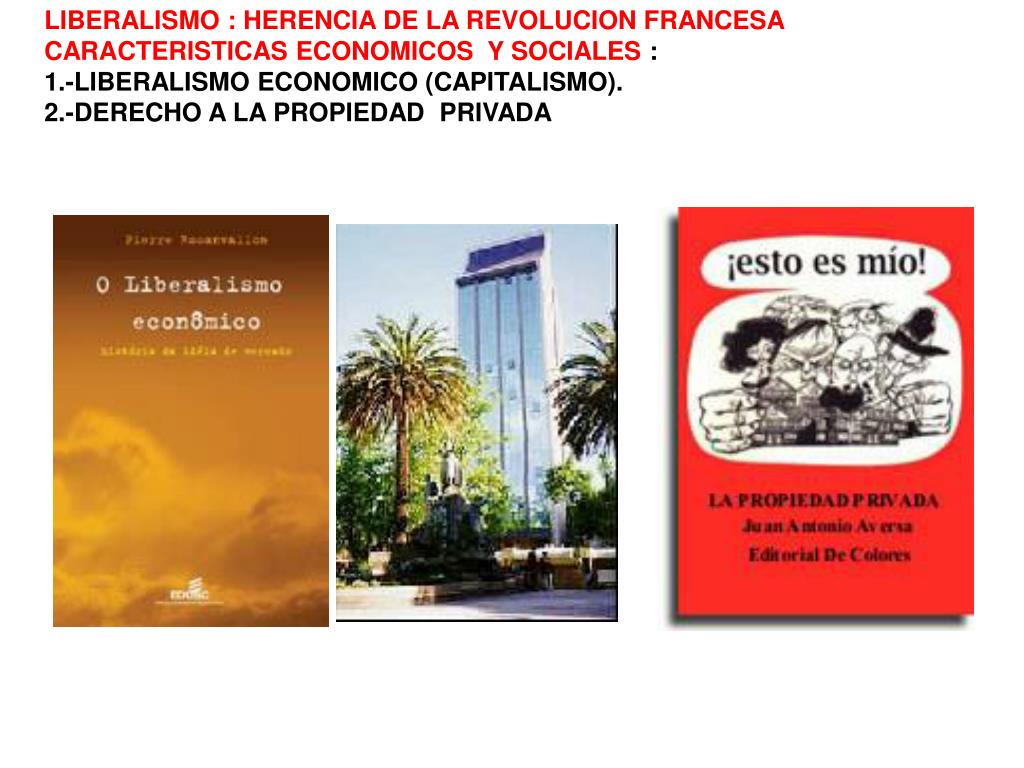 LIBERALISMO : HERENCIA DE LA REVOLUCION FRANCESA CARACTERISTICAS ECONOMICOS Y SOCIALES : 1.-LIBERALISMO ECONOMICO (CAPITALISMO). 2.-DERECHO A LA PROPIEDAD PRIVADA