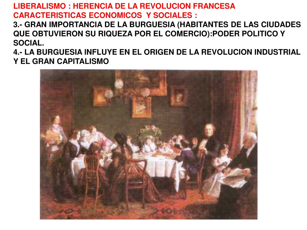 LIBERALISMO : HERENCIA DE LA REVOLUCION FRANCESA CARACTERISTICAS ECONOMICOS Y SOCIALES : 3.- GRAN IMPORTANCIA DE LA BURGUESIA (HABITANTES DE LAS CIUDADES QUE OBTUVIERON SU RIQUEZA POR EL COMERCIO):PODER POLITICO Y SOCIAL. 4.- LA BURGUESIA INFLUYE EN EL ORIGEN DE LA REVOLUCION INDUSTRIAL Y EL GRAN CAPITALISMO