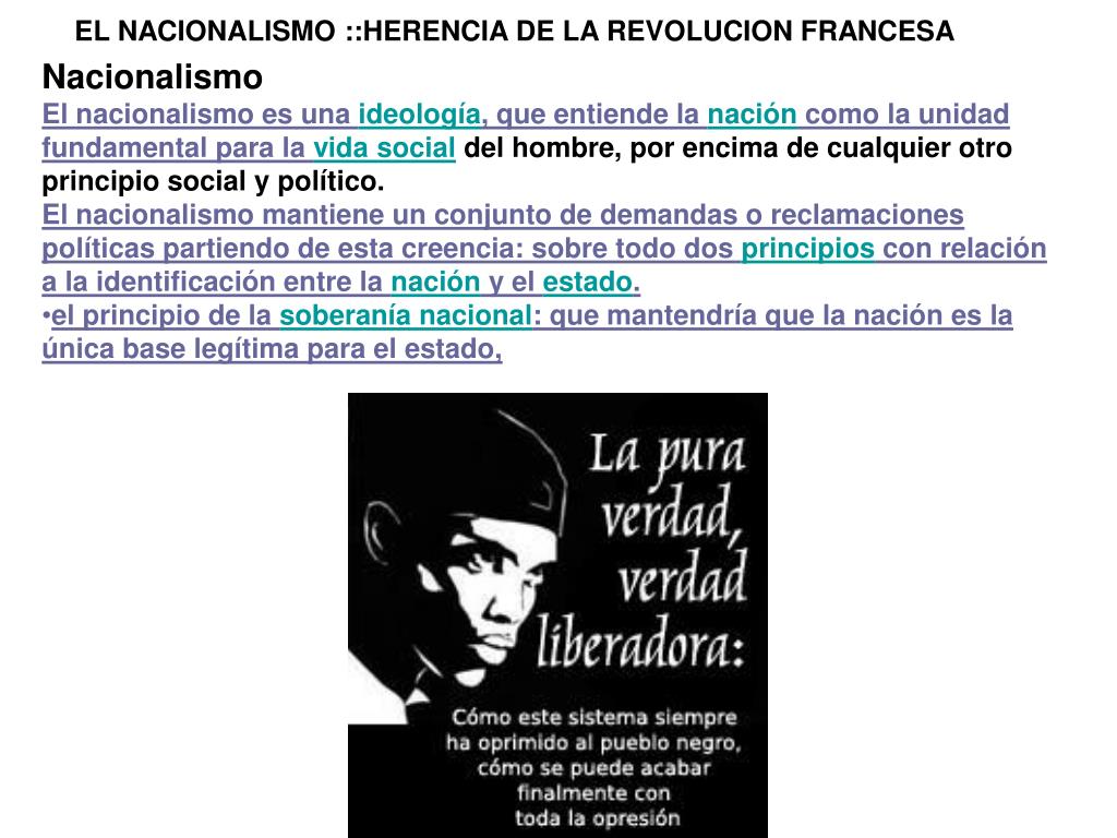 EL NACIONALISMO ::HERENCIA DE LA REVOLUCION FRANCESA • Nacionalismo • El nacionalismo es una ideología, que entiende la nación como la unidad fundamental para la vida social del hombre, por encima de cualquier otro principio social y político. • El nacionalismo mantiene un conjunto de demandas o reclamaciones políticas partiendo de esta creencia: sobre todo dos principios con relación a la identificación entre la nación y el estado. • el principio de la soberanía nacional: que mantendría que la nación es la única base legítima para el estado,