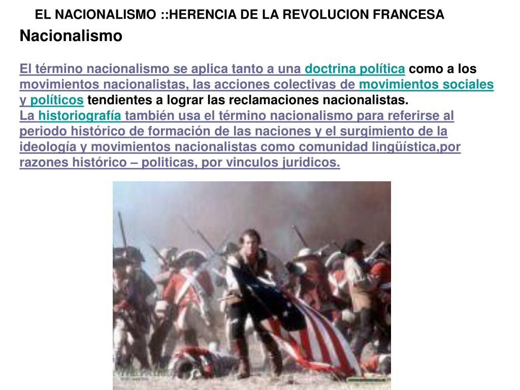 EL NACIONALISMO ::HERENCIA DE LA REVOLUCION FRANCESA Nacionalismo El término nacionalismo se aplica tanto a una doctrina política como a los movimientos nacionalistas, las acciones colectivas de movimientos sociales y políticos tendientes a lograr las reclamaciones nacionalistas. La historiografía también usa el término nacionalismo para referirse al periodo histórico de formación de las naciones y el surgimiento de la ideología y movimientos nacionalistas como comunidad lingüística,por razones histórico – politicas, por vinculos juridicos.