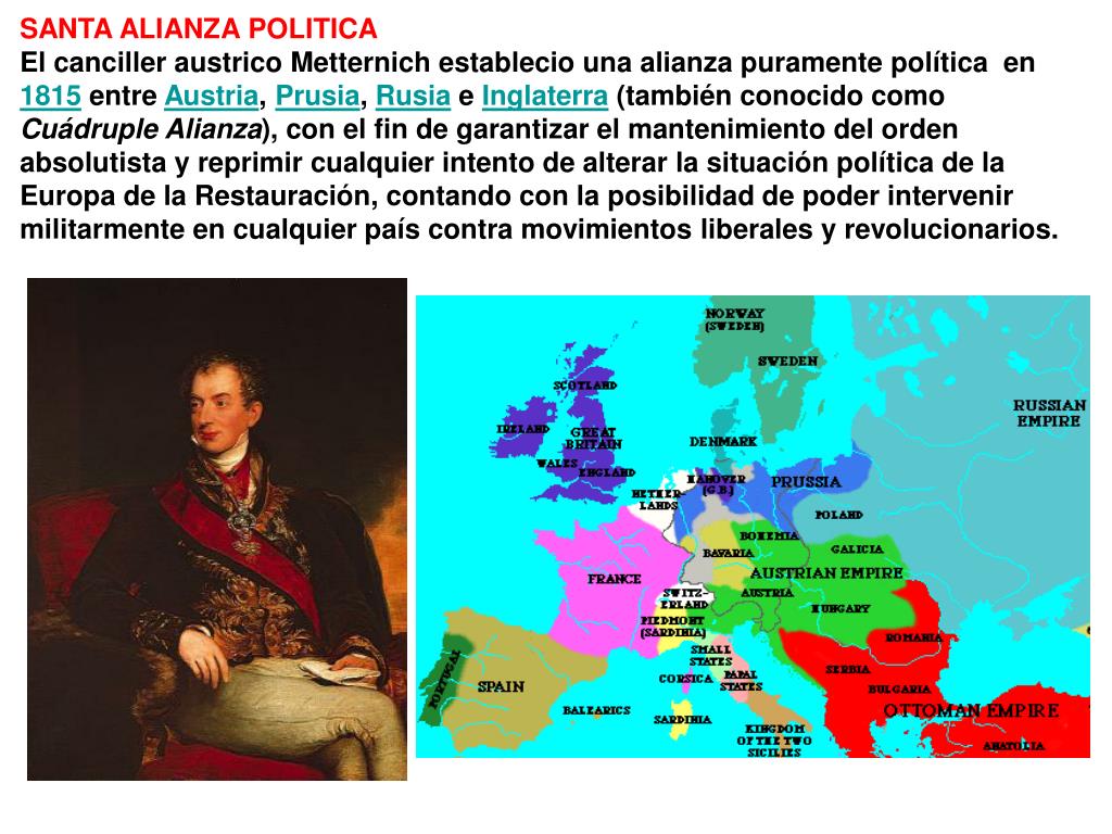 SANTA ALIANZA POLITICA El canciller austrico Metternich establecio una alianza puramente política en 1815 entre Austria, Prusia, Rusia e Inglaterra (también conocido como Cuádruple Alianza), con el fin de garantizar el mantenimiento del orden absolutista y reprimir cualquier intento de alterar la situación política de la Europa de la Restauración, contando con la posibilidad de poder intervenir militarmente en cualquier país contra movimientos liberales y revolucionarios.