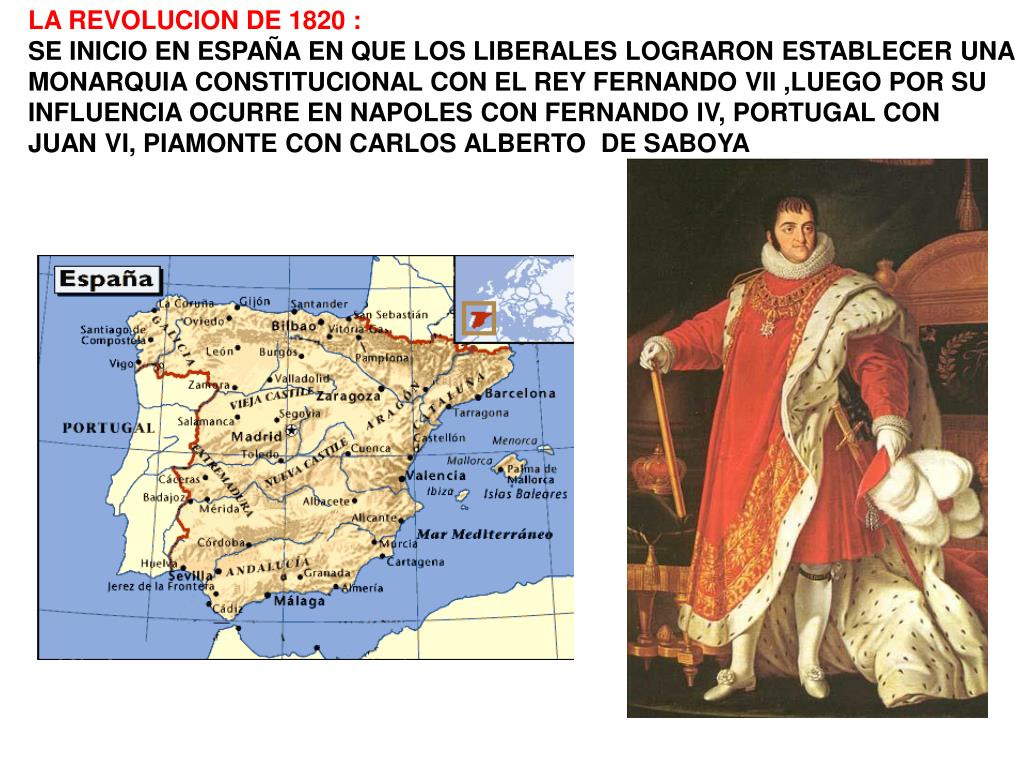 LA REVOLUCION DE 1820 : SE INICIO EN ESPAÑA EN QUE LOS LIBERALES LOGRARON ESTABLECER UNA MONARQUIA CONSTITUCIONAL CON EL REY FERNANDO VII ,LUEGO POR SU INFLUENCIA OCURRE EN NAPOLES CON FERNANDO IV, PORTUGAL CON JUAN VI, PIAMONTE CON CARLOS ALBERTO DE SABOYA