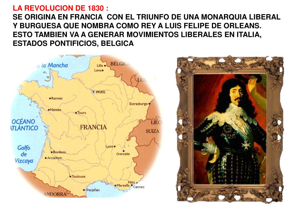 LA REVOLUCION DE 1830 : SE ORIGINA EN FRANCIA CON EL TRIUNFO DE UNA MONARQUIA LIBERAL Y BURGUESA QUE NOMBRA COMO REY A LUIS FELIPE DE ORLEANS. ESTO TAMBIEN VA A GENERAR MOVIMIENTOS LIBERALES EN ITALIA, ESTADOS PONTIFICIOS, BELGICA