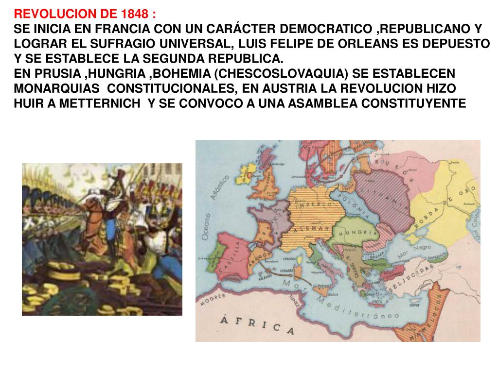REVOLUCION DE 1848 : SE INICIA EN FRANCIA CON UN CARÁCTER DEMOCRATICO ,REPUBLICANO Y LOGRAR EL SUFRAGIO UNIVERSAL, LUIS FELIPE DE ORLEANS ES DEPUESTO Y SE ESTABLECE LA SEGUNDA REPUBLICA. EN PRUSIA ,HUNGRIA ,BOHEMIA (CHESCOSLOVAQUIA) SE ESTABLECEN MONARQUIAS CONSTITUCIONALES, EN AUSTRIA LA REVOLUCION HIZO HUIR A METTERNICH Y SE CONVOCO A UNA ASAMBLEA CONSTITUYENTE
