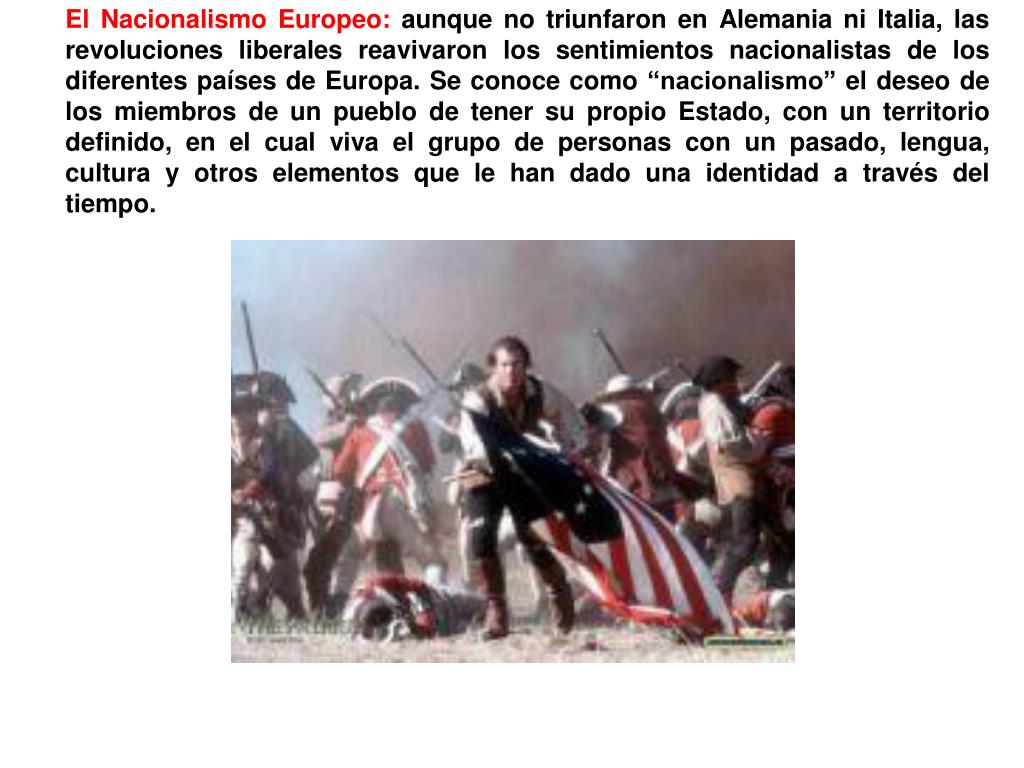 El Nacionalismo Europeo: aunque no triunfaron en Alemania ni Italia, las revoluciones liberales reavivaron los sentimientos nacionalistas de los diferentes países de Europa. Se conoce como “nacionalismo” el deseo de los miembros de un pueblo de tener su propio Estado, con un territorio definido, en el cual viva el grupo de personas con un pasado, lengua, cultura y otros elementos que le han dado una identidad a través del tiempo.