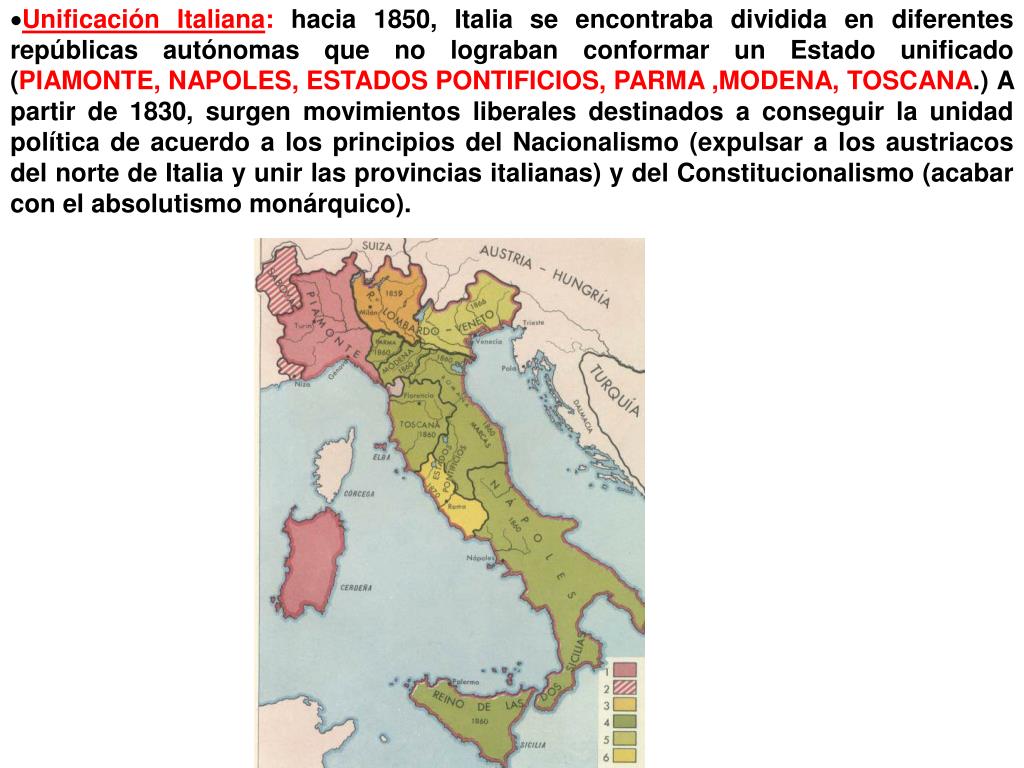 Unificación Italiana: hacia 1850, Italia se encontraba dividida en diferentes repúblicas autónomas que no lograban conformar un Estado unificado (PIAMONTE, NAPOLES, ESTADOS PONTIFICIOS, PARMA ,MODENA, TOSCANA.) A partir de 1830, surgen movimientos liberales destinados a conseguir la unidad política de acuerdo a los principios del Nacionalismo (expulsar a los austriacos del norte de Italia y unir las provincias italianas) y del Constitucionalismo (acabar con el absolutismo monárquico).