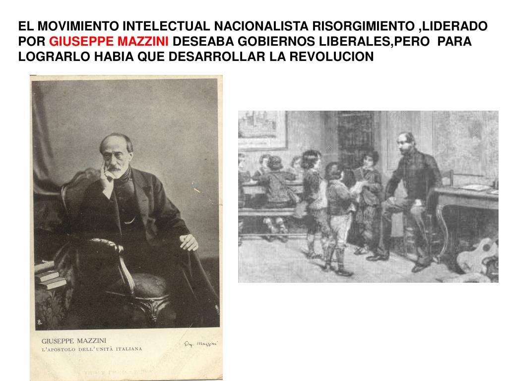 EL MOVIMIENTO INTELECTUAL NACIONALISTA RISORGIMIENTO ,LIDERADO POR GIUSEPPE MAZZINI DESEABA GOBIERNOS LIBERALES,PERO PARA LOGRARLO HABIA QUE DESARROLLAR LA REVOLUCION