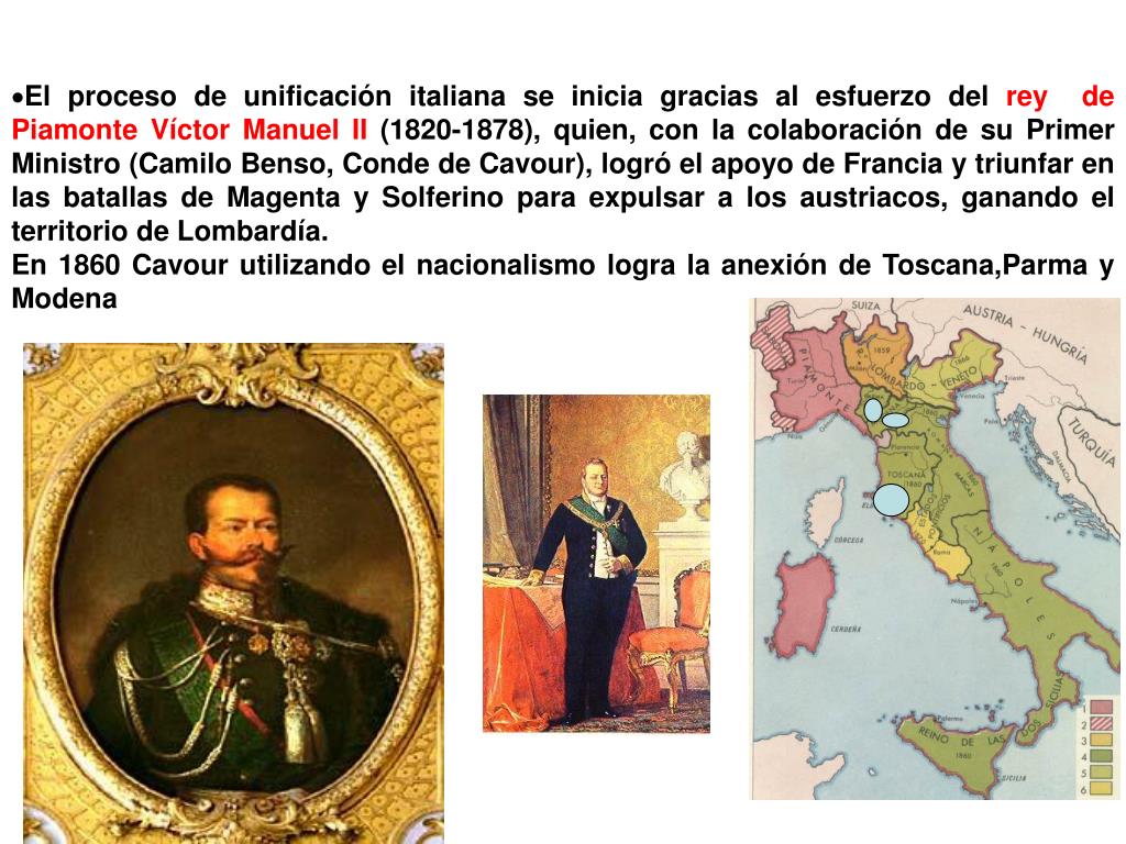 El proceso de unificación italiana se inicia gracias al esfuerzo del rey de Piamonte Víctor Manuel II (1820-1878), quien, con la colaboración de su Primer Ministro (Camilo Benso, Conde de Cavour), logró el apoyo de Francia y triunfar en las batallas de Magenta y Solferino para expulsar a los austriacos, ganando el territorio de Lombardía. En 1860 Cavour utilizando el nacionalismo logra la anexión de Toscana,Parma y Modena
