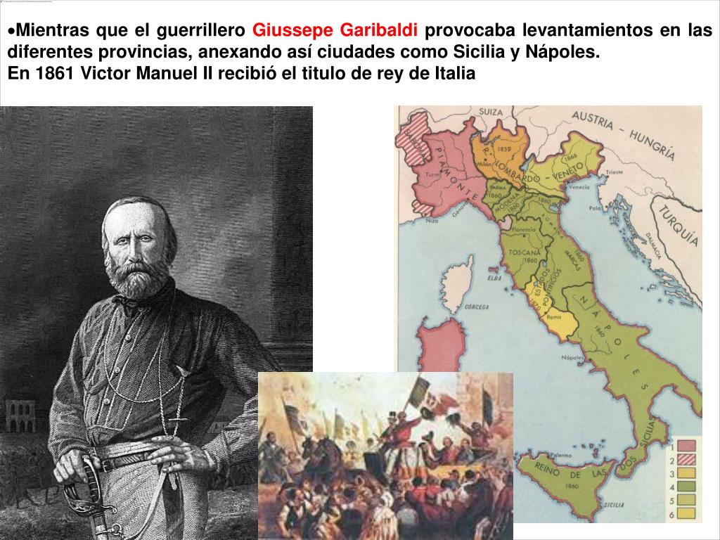 Mientras que el guerrillero Giussepe Garibaldi provocaba levantamientos en las diferentes provincias, anexando así ciudades como Sicilia y Nápoles. En 1861 Victor Manuel II recibió el titulo de rey de Italia
