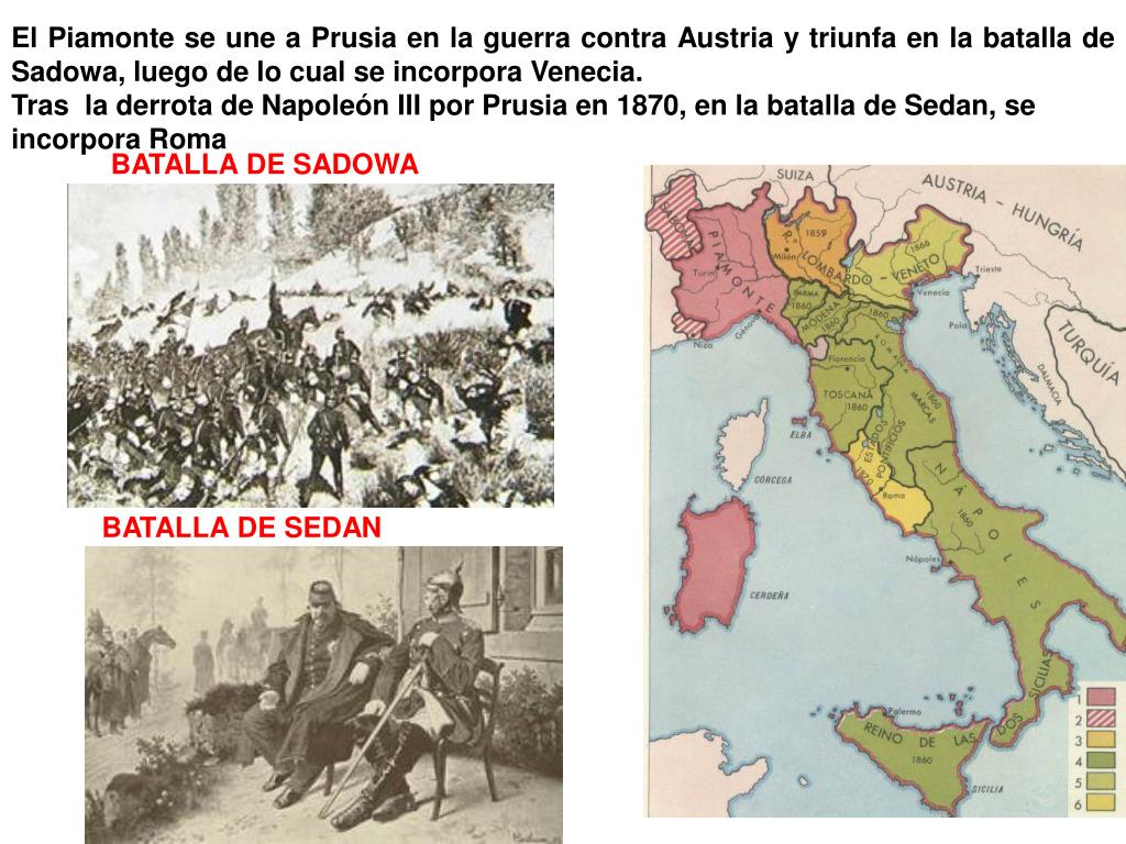 El Piamonte se une a Prusia en la guerra contra Austria y triunfa en la batalla de Sadowa, luego de lo cual se incorpora Venecia. Tras la derrota de Napoleón III por Prusia en 1870, en la batalla de Sedan, se incorpora Roma BATALLA DE SADOWA BATALLA DE SEDAN