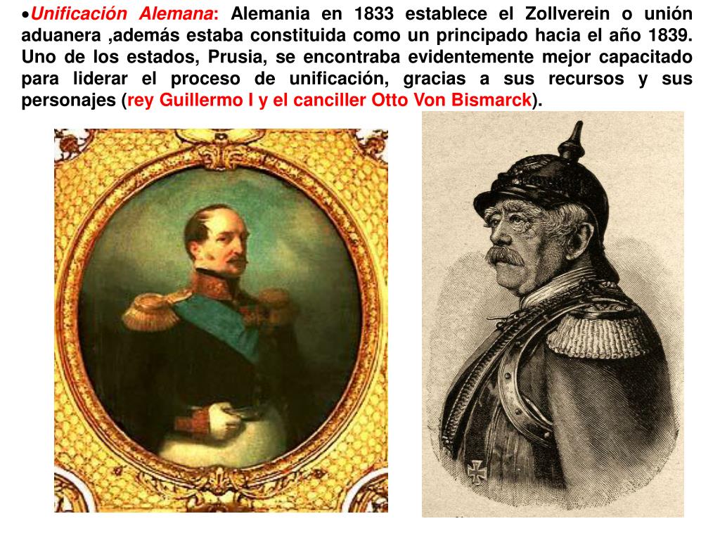 Unificación Alemana: Alemania en 1833 establece el Zollverein o unión aduanera ,además estaba constituida como un principado hacia el año 1839. Uno de los estados, Prusia, se encontraba evidentemente mejor capacitado para liderar el proceso de unificación, gracias a sus recursos y sus personajes (rey Guillermo I y el canciller Otto Von Bismarck).