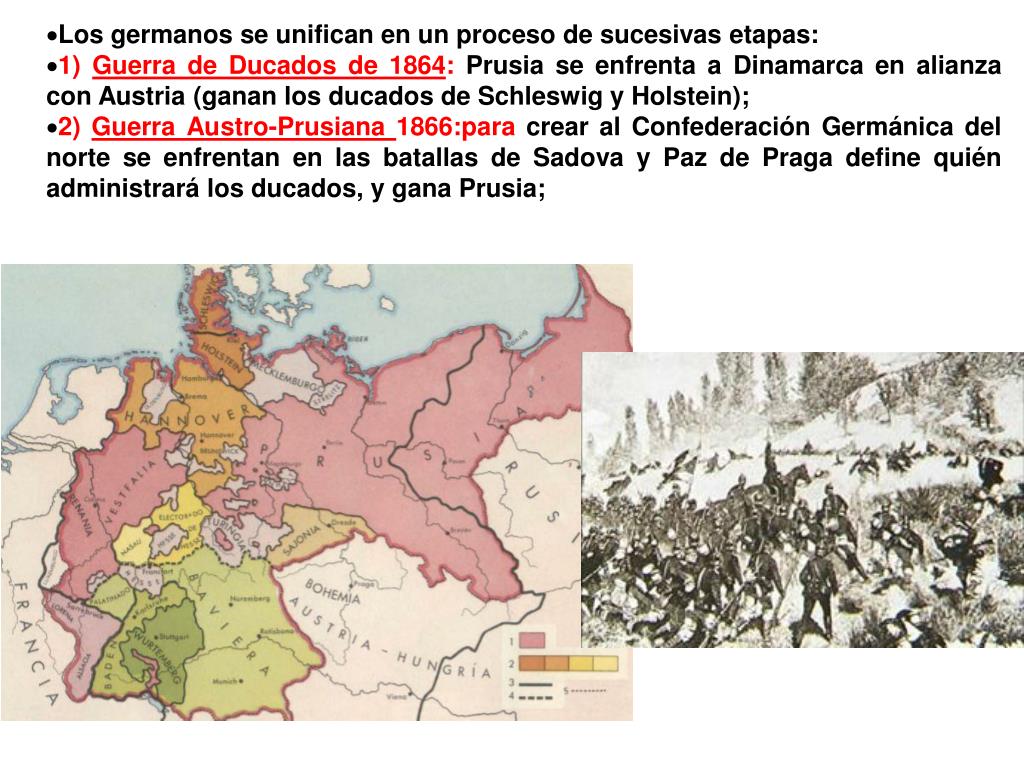 Los germanos se unifican en un proceso de sucesivas etapas: • 1) Guerra de Ducados de 1864: Prusia se enfrenta a Dinamarca en alianza con Austria (ganan los ducados de Schleswig y Holstein); • 2) Guerra Austro-Prusiana 1866:para crear al Confederación Germánica del norte se enfrentan en las batallas de Sadova y Paz de Praga define quién administrará los ducados, y gana Prusia;