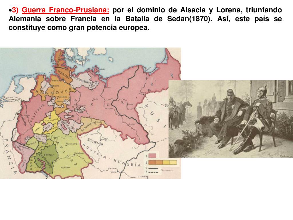 3) Guerra Franco-Prusiana: por el dominio de Alsacia y Lorena, triunfando Alemania sobre Francia en la Batalla de Sedan(1870). Así, este país se constituye como gran potencia europea.