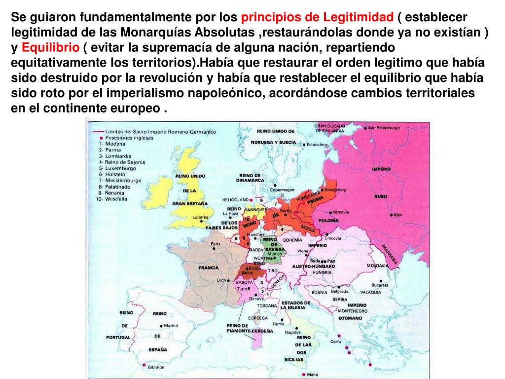 Se guiaron fundamentalmente por los principios de Legitimidad ( establecer legitimidad de las Monarquías Absolutas ,restaurándolas donde ya no existían ) y Equilibrio ( evitar la supremacía de alguna nación, repartiendo equitativamente los territorios).Había que restaurar el orden legitimo que había sido destruido por la revolución y había que restablecer el equilibrio que había sido roto por el imperialismo napoleónico, acordándose cambios territoriales en el continente europeo .