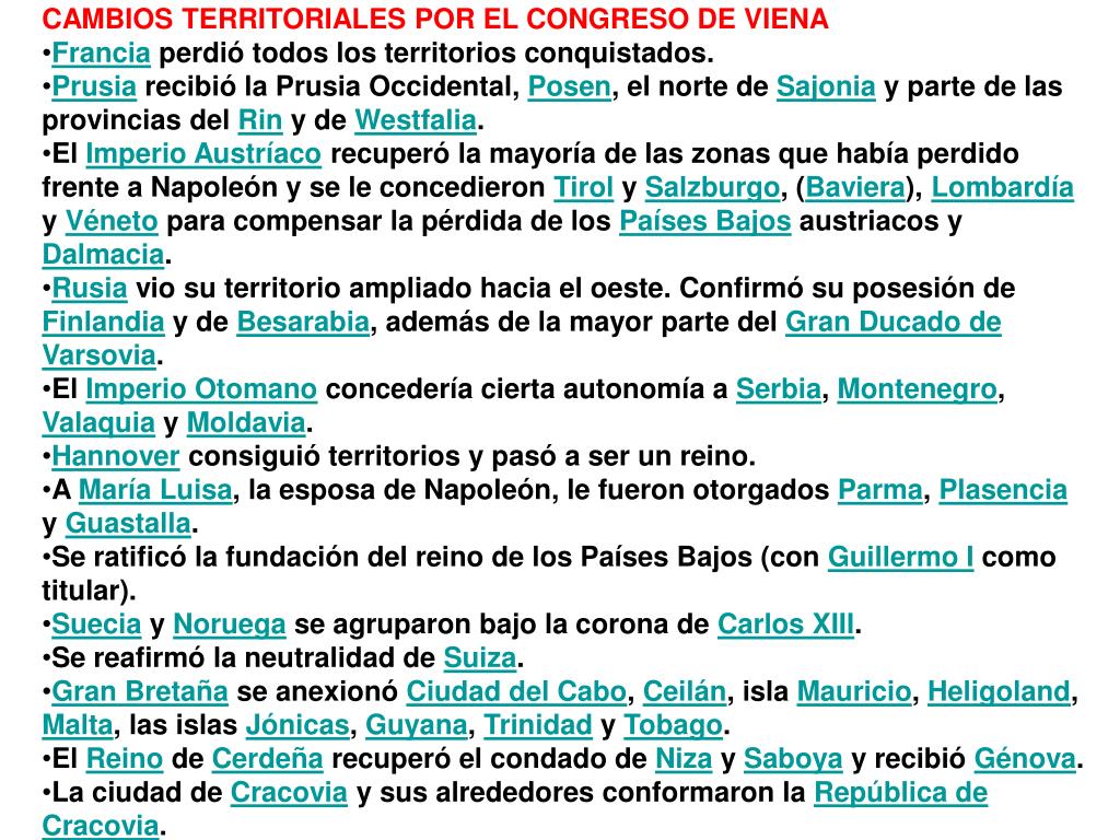 Cambios territoriales Como resultado de las negociaciones sostenidas en el Congreso se decidió: • CAMBIOS TERRITORIALES POR EL CONGRESO DE VIENA • Francia perdió todos los territorios conquistados. • Prusia recibió la Prusia Occidental, Posen, el norte de Sajonia y parte de las provincias del Rin y de Westfalia. • El Imperio Austríaco recuperó la mayoría de las zonas que había perdido frente a Napoleón y se le concedieron Tirol y Salzburgo, (Baviera), Lombardía y Véneto para compensar la pérdida de los Países Bajos austriacos y Dalmacia. • Rusia vio su territorio ampliado hacia el oeste. Confirmó su posesión de Finlandia y de Besarabia, además de la mayor parte del Gran Ducado de Varsovia. • El Imperio Otomano concedería cierta autonomía a Serbia, Montenegro, Valaquia y Moldavia. • Hannover consiguió territorios y pasó a ser un reino. • A María Luisa, la esposa de Napoleón, le fueron otorgados Parma, Plasencia y Guastalla. • Se ratificó la fundación del reino de los Países Bajos (con Guillermo I como titular). • Suecia y Noruega se agruparon bajo la corona de Carlos XIII. • Se reafirmó la neutralidad de Suiza. • Gran Bretaña se anexionó Ciudad del Cabo, Ceilán, isla Mauricio, Heligoland, Malta, las islas Jónicas, Guyana, Trinidad y Tobago. • El Reino de Cerdeña recuperó el condado de Niza y Saboya y recibió Génova. • La ciudad de Cracovia y sus alrededores conformaron la República de Cracovia.