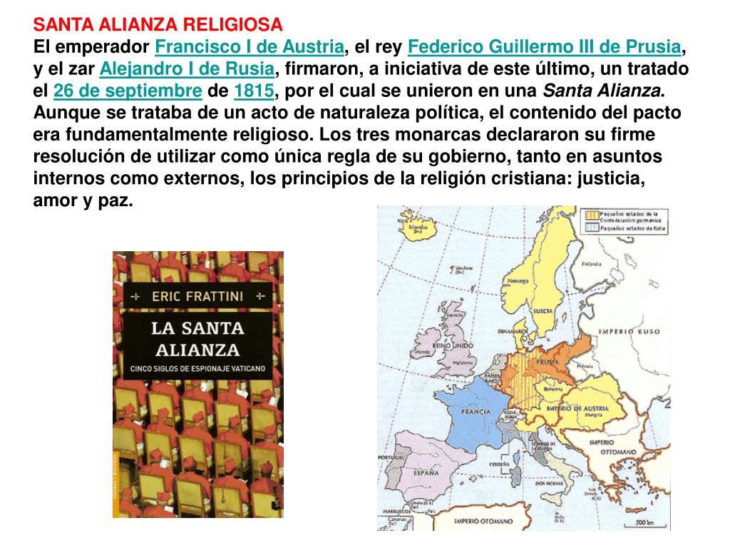 SANTA ALIANZA RELIGIOSA El emperador Francisco I de Austria, el rey Federico Guillermo III de Prusia, y el zar Alejandro I de Rusia, firmaron, a iniciativa de este último, un tratado el 26 de septiembre de 1815, por el cual se unieron en una Santa Alianza. Aunque se trataba de un acto de naturaleza política, el contenido del pacto era fundamentalmente religioso. Los tres monarcas declararon su firme resolución de utilizar como única regla de su gobierno, tanto en asuntos internos como externos, los principios de la religión cristiana: justicia, amor y paz.