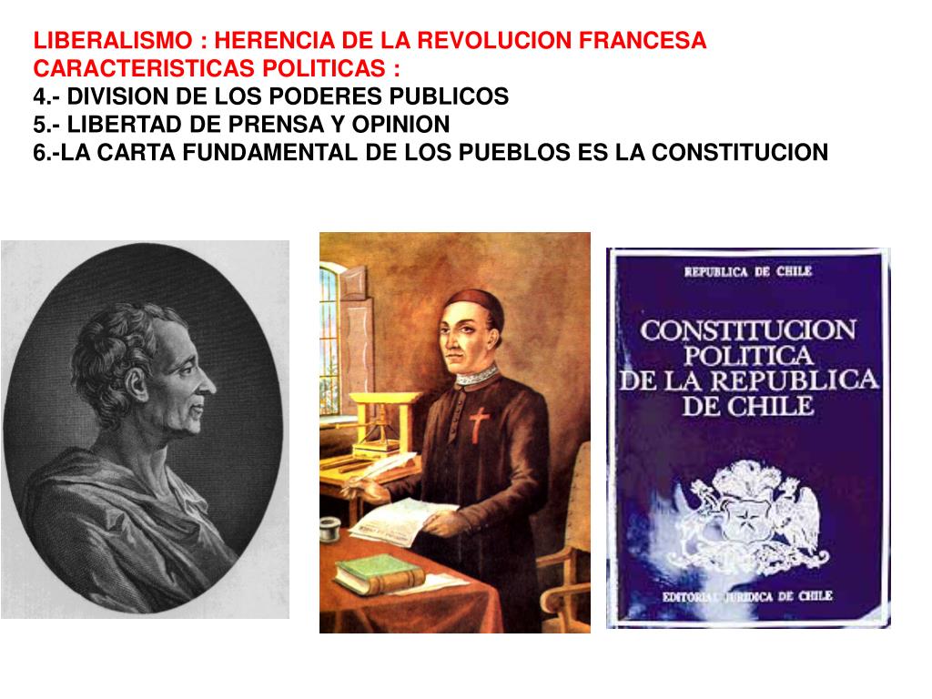 LIBERALISMO : HERENCIA DE LA REVOLUCION FRANCESA CARACTERISTICAS POLITICAS : 4.- DIVISION DE LOS PODERES PUBLICOS 5.- LIBERTAD DE PRENSA Y OPINION 6.-LA CARTA FUNDAMENTAL DE LOS PUEBLOS ES LA CONSTITUCION