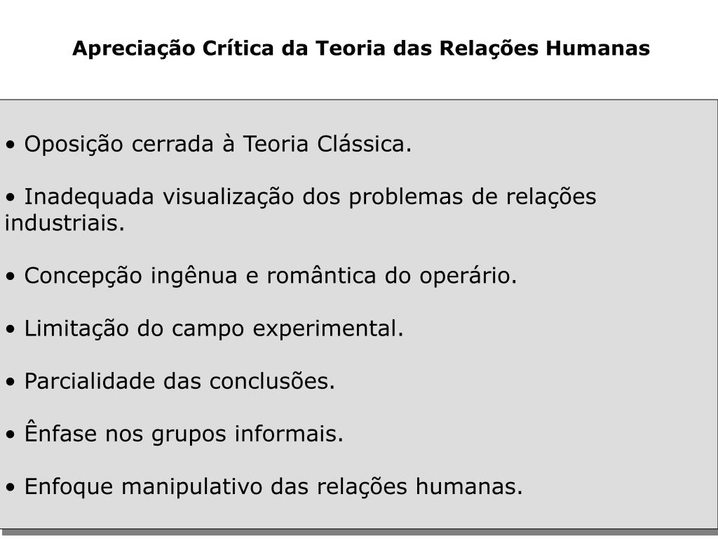 Apreciação Crítica da Teoria das Relações Humanas • Oposição cerrada à Teoria Clássica. • Inadequada visualização dos problemas de relações industriais. • Concepção ingênua e romântica do operário. • Limitação do campo experimental. • Parcialidade das conclusões. • Ênfase nos grupos informais. • Enfoque manipulativo das relações humanas.
