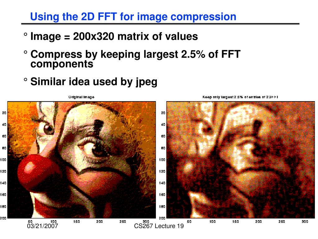 Using the 2D FFT for image compression • Image = 200x320 matrix of values • Compress by keeping largest 2.5% of FFT components • Similar idea used by jpeg CS267 Lecture 19