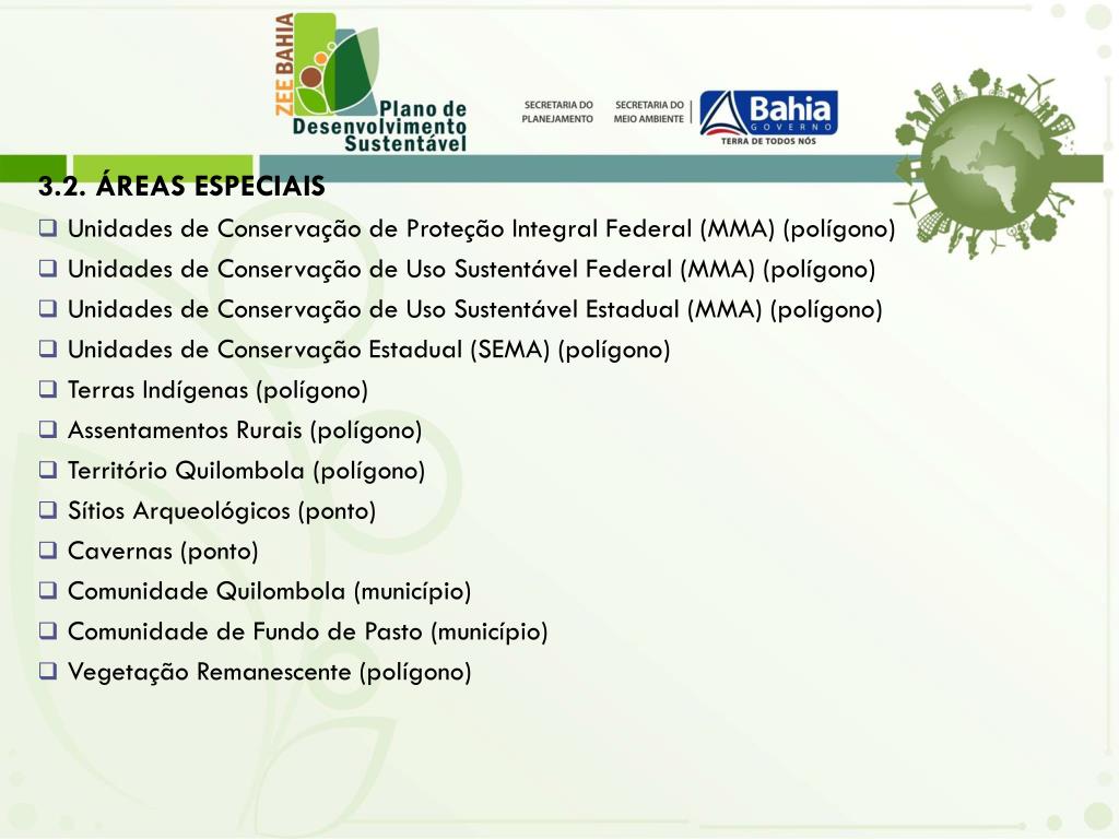 3.2. ÁREAS ESPECIAIS • Unidades de Conservação de Proteção Integral Federal (MMA) (polígono) • Unidades de Conservação de Uso Sustentável Federal (MMA) (polígono) • Unidades de Conservação de Uso Sustentável Estadual (MMA) (polígono) • Unidades de Conservação Estadual (SEMA) (polígono) • Terras Indígenas (polígono) • Assentamentos Rurais (polígono) • Território Quilombola (polígono) • Sítios Arqueológicos (ponto) • Cavernas (ponto) • Comunidade Quilombola (município) • Comunidade de Fundo de Pasto (município) • Vegetação Remanescente (polígono)