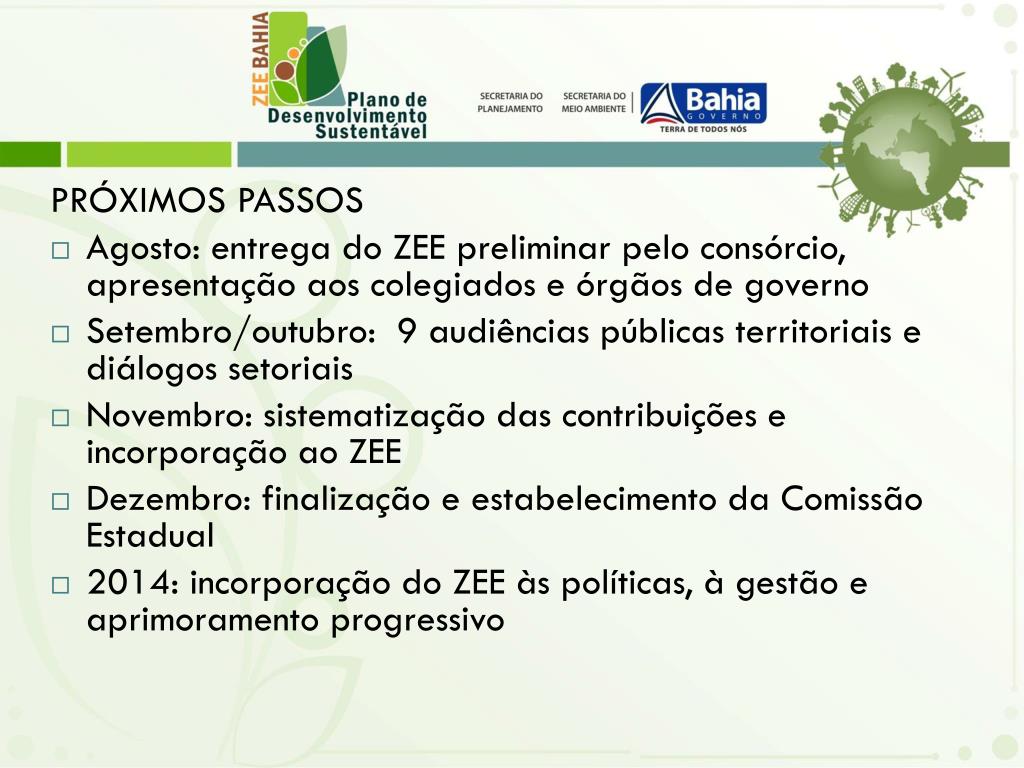 SALVADOR AGOSTO DE 2013. PROCESSO ATÉ HOJE: SEMA-SEPLAN Consórcio Geohidro-Sondotécnica Grupos de trabalhos SEPLAN/SEI e SEMA/INEMA. PRÓXIMOS PASSOS Agosto: entrega do ZEE preliminar pelo consórcio, apresentação aos colegiados e órgãos de governo