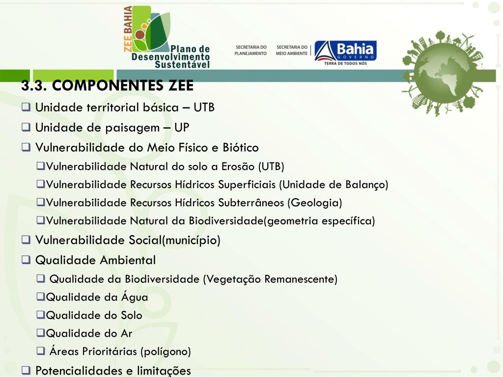 3.3. COMPONENTES ZEE • Unidade territorial básica – UTB • Unidade de paisagem – UP • Vulnerabilidade do Meio Físico e Biótico • Vulnerabilidade Natural do solo a Erosão (UTB) • Vulnerabilidade Recursos Hídricos Superficiais (Unidade de Balanço) • Vulnerabilidade Recursos Hídricos Subterrâneos (Geologia) • Vulnerabilidade Natural da Biodiversidade(geometria específica) • Vulnerabilidade Social(município) • Qualidade Ambiental • Qualidade da Biodiversidade (Vegetação Remanescente) • Qualidade da Água • Qualidade do Solo • Qualidade do Ar • Áreas Prioritárias (polígono) • Potencialidades e limitações
