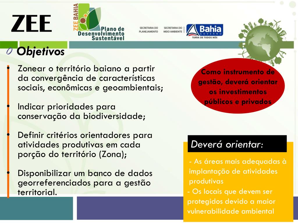 ZEE ZEE • Objetivos • Zonear o território baiano a partir da convergência de características sociais, econômicas e geoambientais; • Indicar prioridades para conservação da biodiversidade; • Definir critérios orientadores para atividades produtivas em cada porção do território (Zona); • Disponibilizar um banco de dados georreferenciados para a gestão territorial. • Como instrumento de gestão, deverá orientar os investimentos públicos e privados Deverá orientar: • - As áreas mais adequadas à implantação de atividades produtivas • - Os locais que devem ser protegidos devido a maior vulnerabilidade ambiental